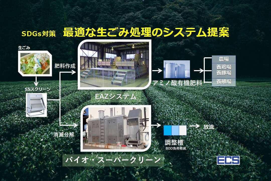 令和時代に開発されたEAZシステムは、今までのBSAにさらにアミノ酸液肥処理装置を加えてゼロエミッション化と価値の創出を共に実現し、SDGs最高峰の生ごみ処理措置です。