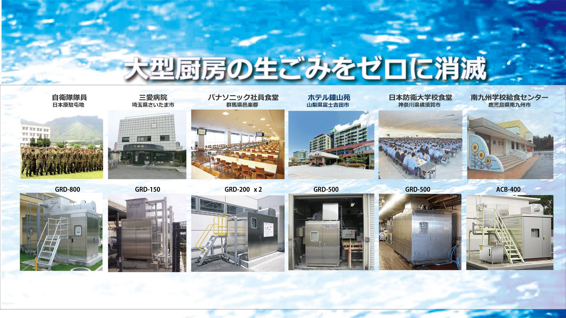 ◎ 食品工場・給食センター・セントラルキッチン・ホテルの厨房・病院の厨房・大型マンションなど、一日に大量の生ごみを排出する導入実績が数十社あります